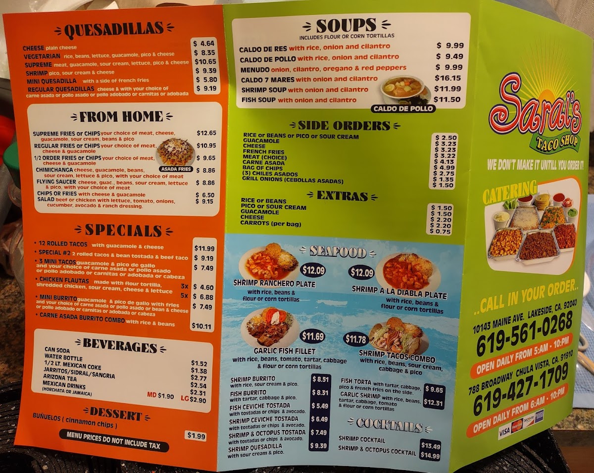 If you're craving authentic, mouthwatering tacos in a cozy spot, look no further than Sarais Taco Shop Menu. Located at 10143 Maine Ave, Lakeside, CA, this hidden gem offers a variety of flavorful options that will hit the spot every time. Whether you're in the mood for a classic carne asada taco or something with a bit of spice, they've got you covered. The menu features everything from delicious tacos to burritos, quesadillas, and freshly made salsas that pack just the right punch.